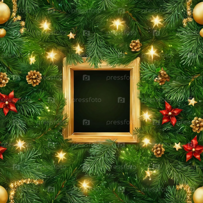 Яркие еловые ветки создают праздничный фон, украшенный золотыми украшениями, красными цветами и мерцающими огнями, приглашая к творчеству в пустом центре. Генеративный ИИ