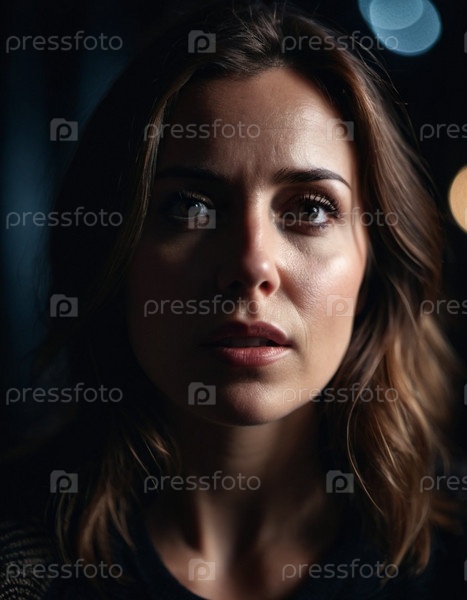 Женщина с нахмуренными бровями и обеспокоенным выражением лица смотрит прямо в камеру. Освещение тусклое, отбрасывает тени вокруг лица, подчеркивая ее стресс. Страх, разочарование, расстройство, беспокойство и задумчивость. ИИ