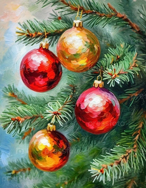 Красочные рождественские украшения украшают ветви ели, яркие шары в оттенках красного, золотого и розового, олицетворяющие праздничное настроение зимой. Художественный фон Happy New Year. Генеративный ИИ