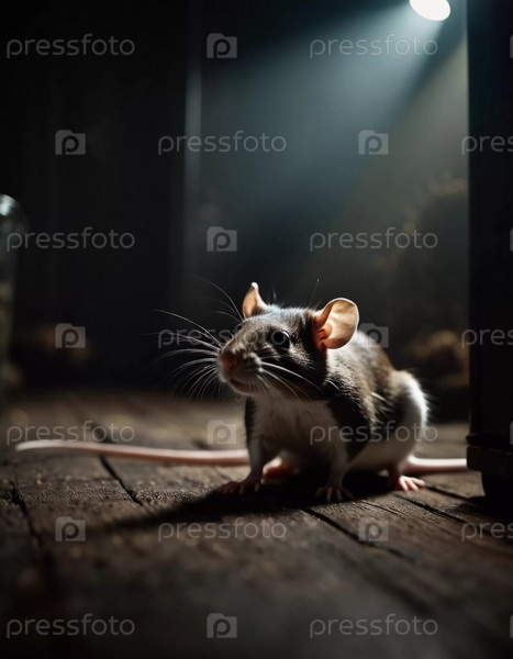 Маленькая крыса перемещается по темному пространству, освещенному мерцающей лампой. Усы дергаются, когда она исследует окрестности в поздние часы. Страшная атмосфера вампира или Хэллоуина. Генеративный ИИ