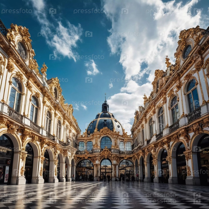 Посетители с удовольствием исследуют великолепный торговый центр с грандиозными архитектурными деталями и поразительным куполом под голубым небом с пушистыми облаками. Генеративный ИИ