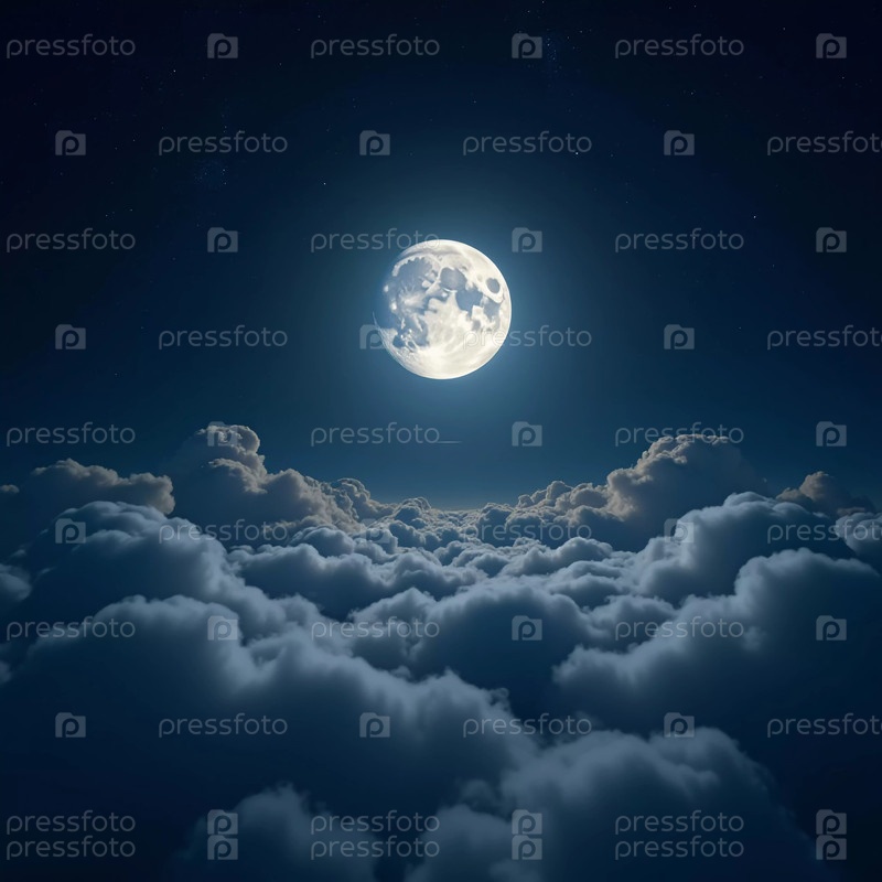 Светящаяся луна висит в темном небе, окруженная мягкими облаками, которые создают мечтательную атмосферу. Сцена приглашает к тихим моментам размышлений и удивления под звездами. Генеративный ИИ