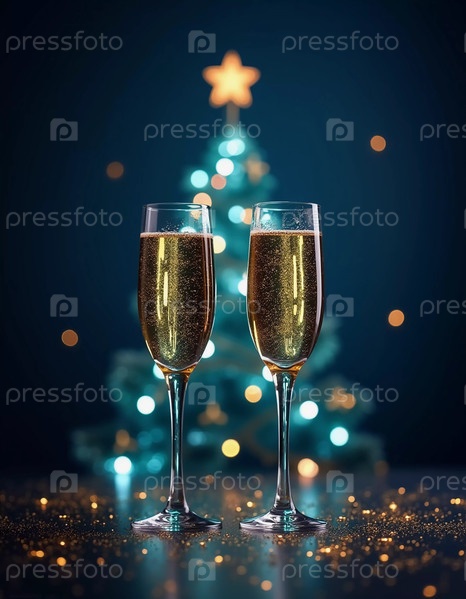 Два сверкающих бокала шампанского элегантно стоят на фоне украшенной рождественской елки, передавая дух праздника золотым мерцанием. Генеративный ИИ