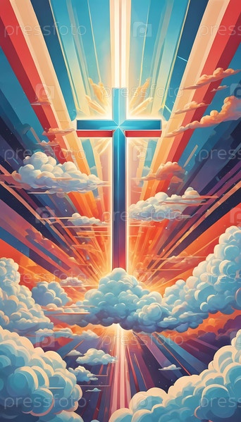 Яркий крест возвышается среди разноцветных облаков, от которых исходят лучистые лучи света, создавая небесную атмосферу в безмятежный момент. Генеративный ИИ