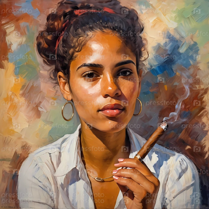 Молодая кубинская женщина уверенно позирует с сигарой, олицетворяя богатую культуру Кубы. Ее выражение лица показывает чувство гордости, поскольку она наслаждается этим традиционным времяпрепровождением. Генеративный ИИ