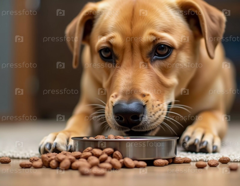 Игривая собака сидит на мягком ковре, сосредоточенно поедая сухой корм из миски. Вокруг миски разбросаны кусочки еды, отражающие ее энтузиазм. Теплый дневной свет заполняет комнату AI