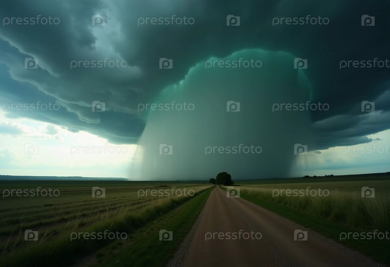 Мощная суперячейковая буря опускается на сельский пейзаж, ее зловещие облака затягивают горизонт. Сильно льет дождь, создавая драматическую атмосферу вдоль пустой грунтовой дороги Генеративный ИИ