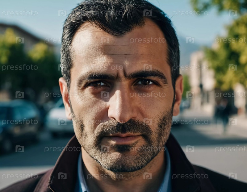В оживленной городской обстановке армянский мужчина излучает уверенность благодаря своей волевой линии подбородка и сосредоточенному выражению лица