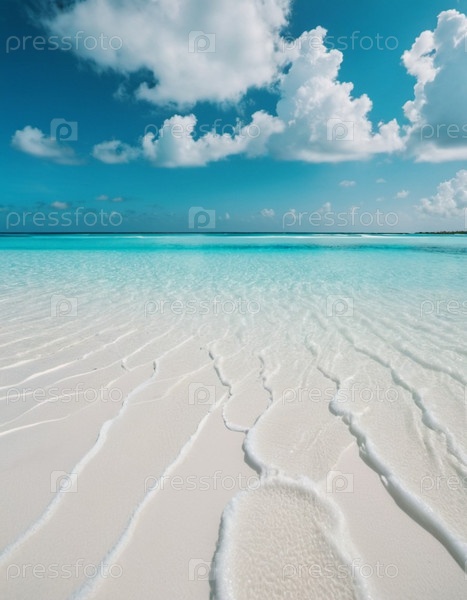 Захватывающий вид на нетронутый белый песчаный пляж на Мальдивах. Бирюзовые воды Индийского океана нежно плещутся у берега, создавая безмятежную идиллическую картину. Небо ярко-голубое, усеянное пушистыми белыми облаками