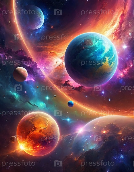 Планетарная система с несколькими планетами, большим ярко окрашенным газовым гигантом и каменистой планетой. Яркие звезды и огромное пространство темного космоса с галактикой на заднем плане. Космические просторы. Космонавтика. ИИ