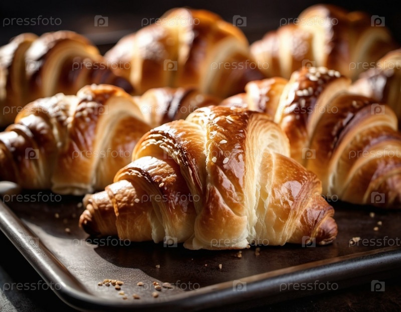 Ассорти из золотисто-коричневых круассанов на деревенском подносе. Теплый ароматный аромат наполняет уютную кухню. Привлекательная выкладка предполагает расслабляющую утреннюю встречу, идеальный завтрак-бранч с друзьями семьи