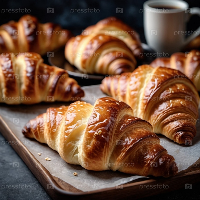 Ассорти из золотисто-коричневых круассанов на деревенском подносе. Теплый ароматный аромат наполняет уютную кухню. Привлекательная выкладка предполагает расслабляющую утреннюю встречу, идеальный завтрак-бранч с друзьями семьи