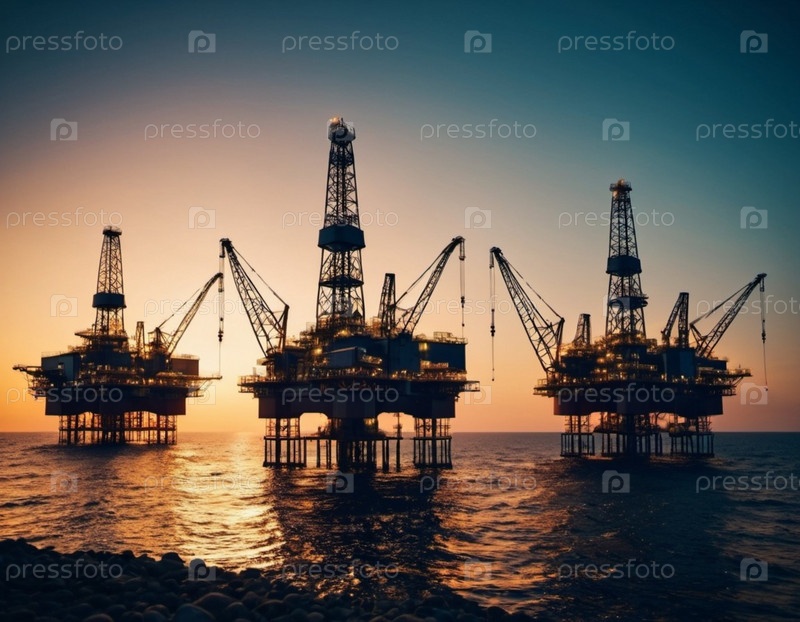 Большая, освещенная морская нефтяная вышка возвышается в воде в сумерках. Огни вышки отбрасывают теплый свет на темнеющее небо, а силуэт платформы обрамлен рябью воды. AI