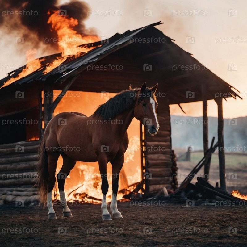 Лошадь встает на дыбы среди сильного пламени и густого дыма, которые окутывают деревянную избу. Огонь потрескивает. Русская пословица: есть женщины в русских деревнях, которые могут остановить коня на скаку и войти в горящую избу