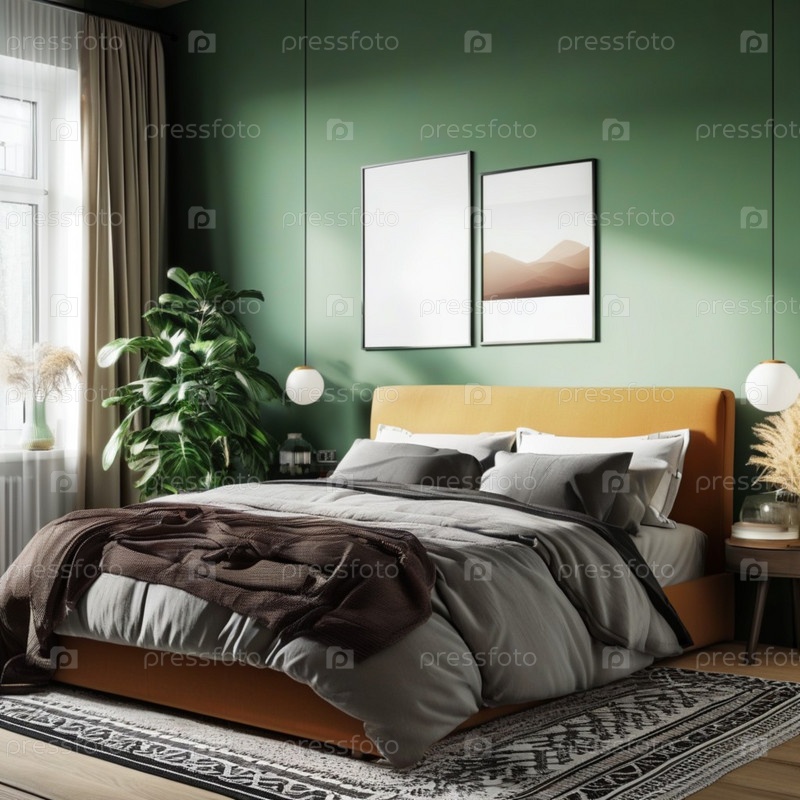Спокойная спальня в скандинавском стиле с нейтральными тонами, естественным освещением и уютным текстилем, созданным для спокойного отдыха. Генеративный ИИ. Зеленые стены
