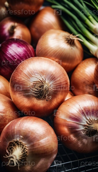 Разнообразные свежие крупные луковицы аккуратно разложены на прилавке супермаркета, демонстрируя свою блестящую коричневую кожуру и приглашая покупателей выбрать их для приготовления пищи или употребления в пищу. Генеративный ИИ