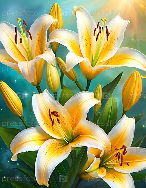 Композиция включает в себя яркие белые лилии в полном цвету, окруженные сочной зеленой листвой, демонстрируя красоту весны. Бутоны и лепестки блестят в теплых солнечных лучах. Генеративный ИИ