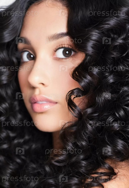 Сияющие кудри обрамляют молодое лицо, демонстрируя великолепные черные блестящие волосы с четко очерченными спиралями. Мягкий свет подчеркивает текстуру и глубину локонов, создавая потрясающий вид. Генеративный ИИ