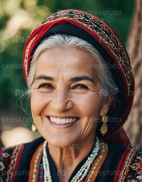 Зрелая таджикская женщина 75 лет улыбается, демонстрируя сложную традиционную одежду и богатое культурное наследие своей национальности, пробуждая мудрость и изящество. Брюнетка, в платке. AI