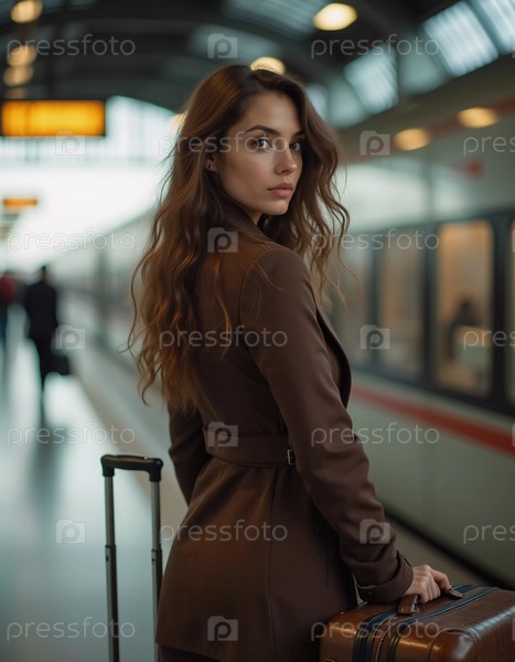 Девушка с волнистыми волосами стоит на вокзале, поворачиваясь, чтобы посмотреть в камеру, держа чемодан. Путешественники суетятся мимо нее, пока она ждет свой поезд. Красивая молодая женщина. Генеративный ИИ