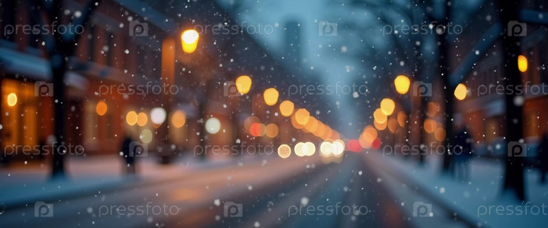 Тихий зимний вечер окутывает городскую улицу, где мягко падающий снег усиливает свечение рождественских огней. Праздничная атмосфера привлекает людей, празднующих Новый год. Генеративный ИИ