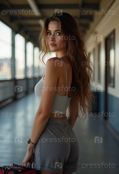 Девушка с волнистыми волосами стоит на вокзале, поворачиваясь, чтобы посмотреть в камеру, держа чемодан. Путешественники суетятся мимо нее, пока она ждет свой поезд. Красивая молодая женщина. Генеративный ИИ