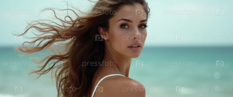 Брюнетка в купальнике смотрит назад, стоя у береговой линии. Нежные морские волны плещутся у ее ног под ясным голубым небом. Длинные волосы, красивое молодое лицо. Реклама путешествий и одежды. AI