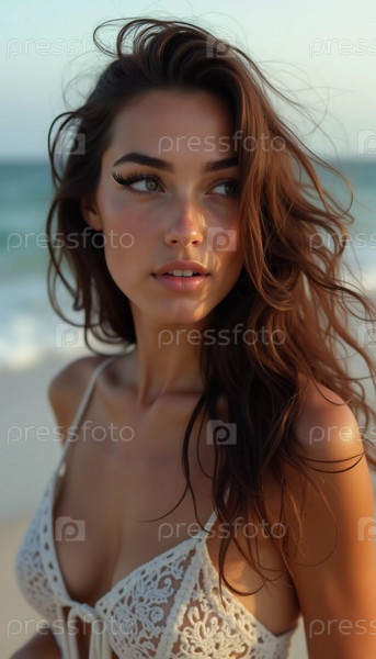 Брюнетка в купальнике смотрит назад, стоя у береговой линии. Нежные морские волны плещутся у ее ног под ясным голубым небом. Длинные волосы, красивое молодое лицо. Реклама путешествий и одежды. AI