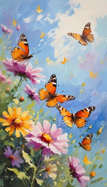 Красочные бабочки грациозно порхают над яркими полями, создавая живую и радостную атмосферу на залитом солнцем лугу. Генеративный ИИ