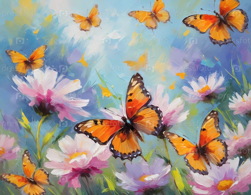 Красочные бабочки грациозно порхают над яркими полями, создавая живую и радостную атмосферу на залитом солнцем лугу. Генеративный ИИ