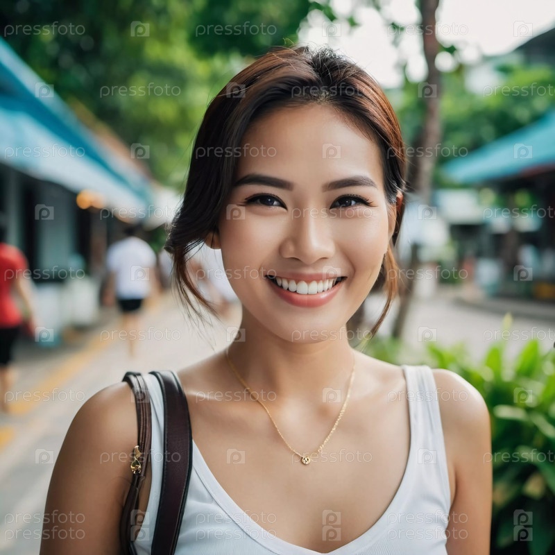 Веселая женщина стоит в тропической обстановке Таиланда, демонстрируя свою яркую улыбку. На заднем плане — пышная зелень и намеки на оживленную уличную жизнь, что создает живую атмосферу. Генеративный ИИ