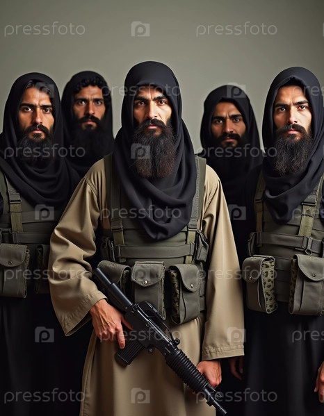 Группа вооруженных мужчин, одетых в традиционную одежду, стоит сплоченно, демонстрируя товарищество и готовность. Воинствующие мусульмане, похожие на Талибан или пакистанскую армию. Густая борода. Генеративный ИИ