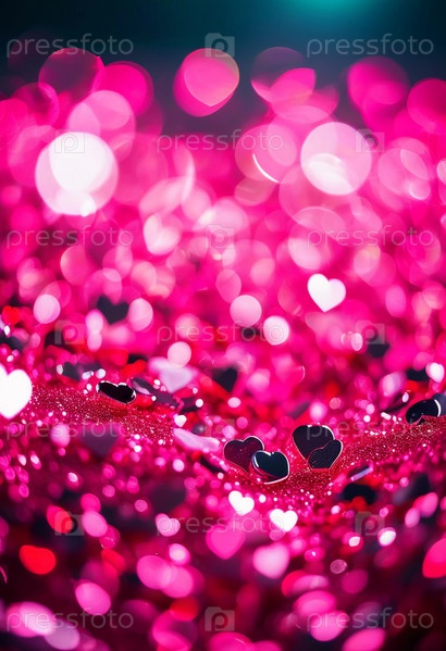 Блестящие розовые сердечки разбросаны по яркому фону, наполненному сверкающими огнями, создавая романтическое настроение для празднеств и торжеств в честь Дня святого Валентина. Генеративный ИИ