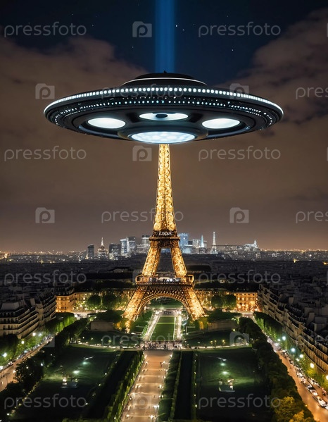 НЛО в форме диска зависает над Эйфелевой башней в Париже на закате, отбрасывая теплое сияние на городской пейзаж и освещая знаковую достопримечательность. Генеративный ИИ