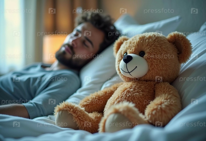 Больной на больничной койке находит утешение в плюшевом мишке, который отдыхает рядом с ним, олицетворяя утешение и надежду. Мягкое освещение усиливает этот нежный момент исцеления