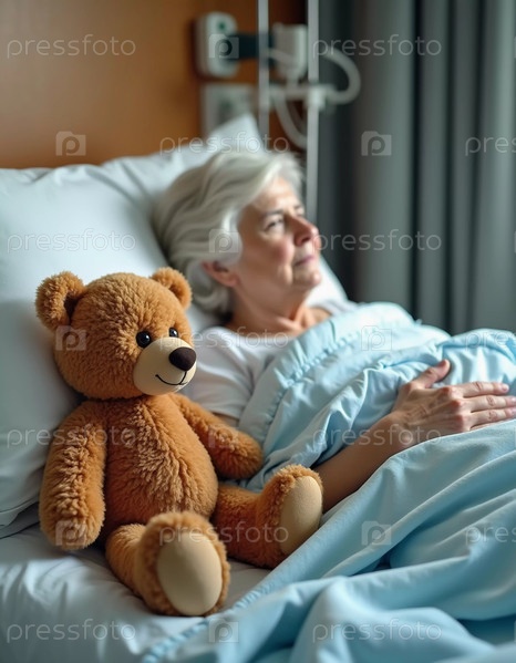 В больничной палате, наполненной мягкими, успокаивающими цветами, пожилая женщина лежит в постели, погруженная в свои мысли. Рядом с ней сидит теплый плюшевый мишка, символизирующий утешение и товарищество в трудные времена
