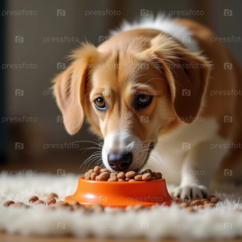 Веселая собака с мягкой шерстью приседает у оранжевой миски, наполненной сухим кормом, смакуя каждый кусочек в теплом, уютном помещении, залитом солнечным светом. ИИ