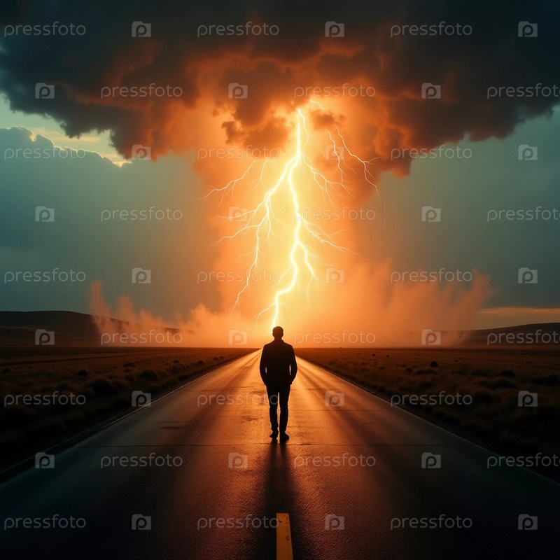 Одинокая фигура смотрит вверх, пока сильная гроза охватывает ландшафт, бросая зловещее свечение на пустынную дорогу во время сильного погодного явления Генеративный ИИ