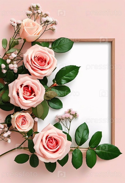 Нежно-розовые розы и пышная зелень создают прекрасный цветочный шедевр вокруг пустой рамки, идеально подходящий для запечатления сердечных чувств или особых заметок в любой заветный день. Генеративный искусственный интеллект