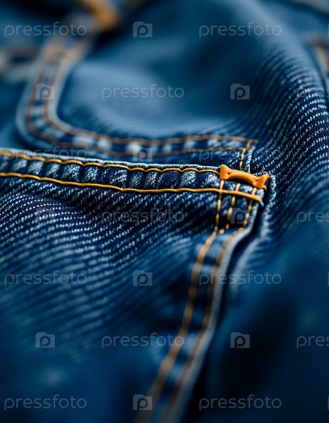 Крупным планом можно рассмотреть детальный шов и карман джинсов из синего денима, подчеркивая мастерство и уникальную текстуру, которые характеризуют современную повседневную одежду