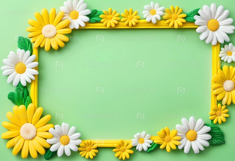 Нежные ромашки белого и желтого цветов на ярко-зеленом фоне образуют причудливую цветочную рамку, полную очарования, идеально подходящую для прославления творчества и красоты природы