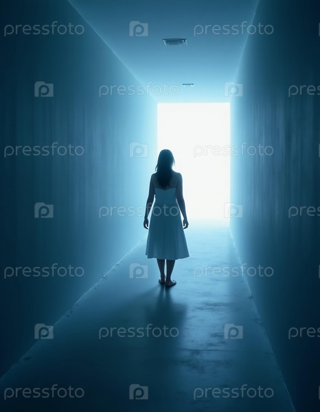 В тихом коридоре фигура в белом платье движется к яркому белому свету, символизирующему безмятежное прохождение через эфирное царство перехода и обновления. Генеративный ИИ