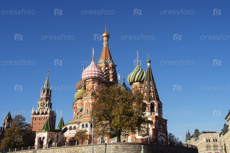 Москва, Россия - 21 октября 2024 года: Спасская башня - Московский Кремль. Собор Василия Блаженного на Красной площади. Древний памятник архитектуры. Достопримечательность Москвы