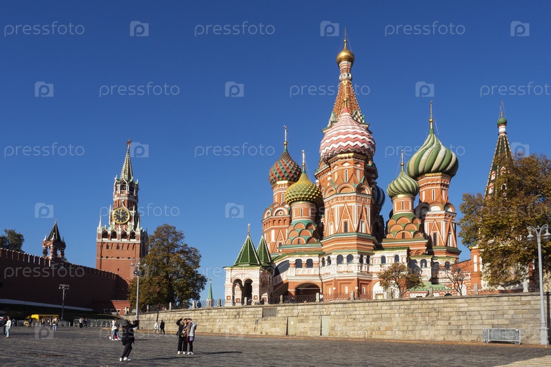 Москва, Россия - 21 октября 2024 года: Спасская башня - Московский Кремль. Собор Василия Блаженного на Красной площади. Древний памятник архитектуры. Достопримечательность Москвы