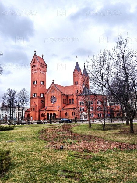 Минск, Беларусь - 05 апреля 2025 г.: Костел Святых Симеона и Елены. Католический костел на площади Независимости в центре Минска