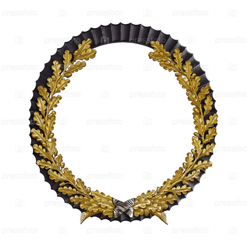 Черная деревянная рама с золотым венком и траурной лентой для картин, зеркал или фотографий, изолированных на белом фоне. Элемент дизайна с обтравочным контуром