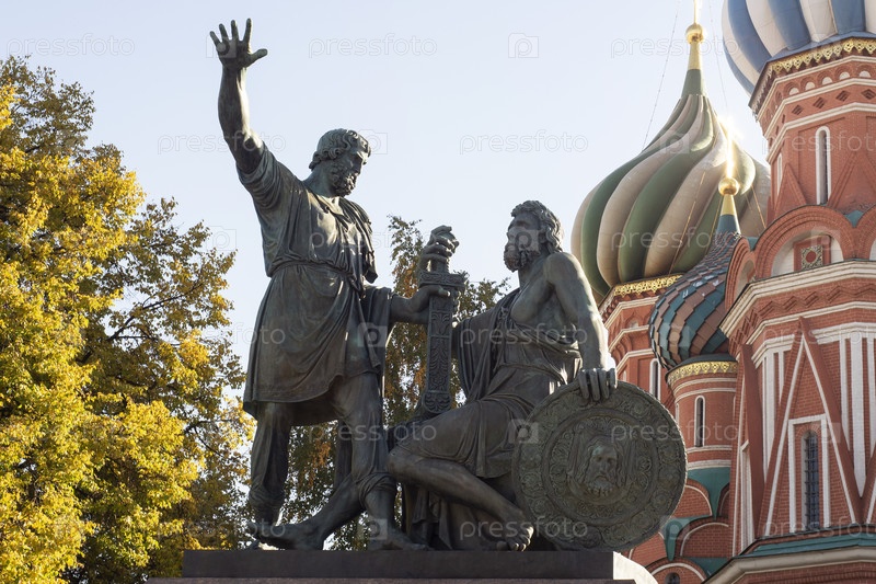 Москва, Россия - 21 октября 2024 г.: Памятник Минину и Пожарскому на Красной площади напротив собора Василия Блаженного в Москве, Россия