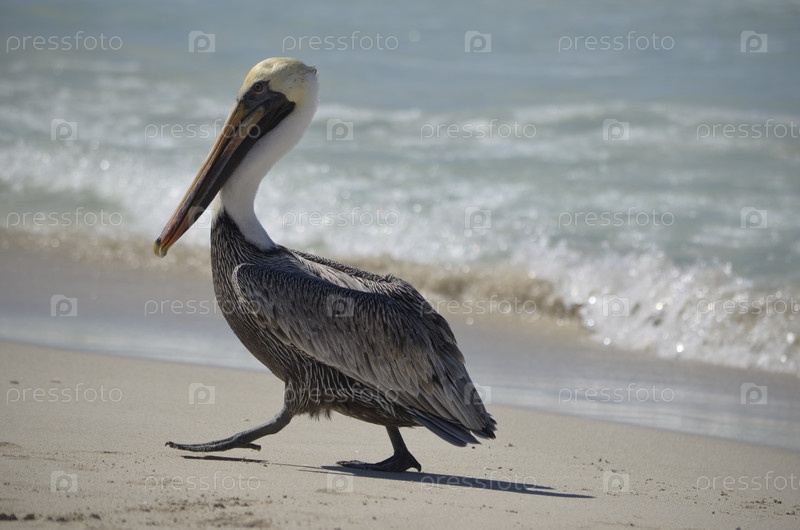 Важный пеликан шагает по пляжу Варадеро на северном побережье Кубы, в провинции Матансас, на полуострове Икакос