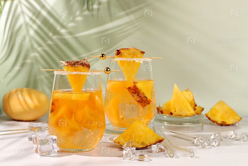Рецепт освежающего летнего диетического напитка, холодный домашний коктейль или лимонад с ананасом, апельсином, льдом на солнечном кухонном современном столе, диета для детоксикации и концепция летней вечеринки. Меню ресторана, избирательный подход