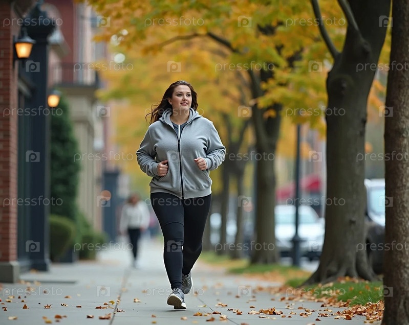 Толстая женщина в спортивном костюме бежит по тротуару в городе